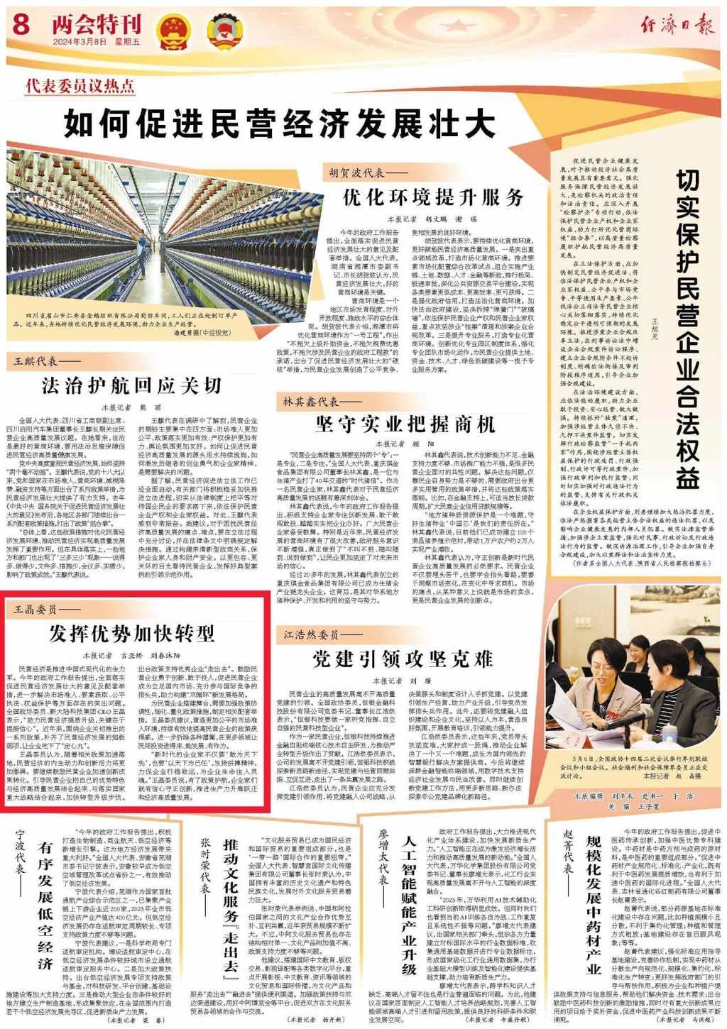 “新時代的企業家不僅要‘敢為天下先’,也要‘以天下為己任’,發揚拼搏精神,力促企業行穩致遠,為企業生命注入靈魂。”王晶委員說,有了政策護航,企業家們就有信心守正創新,推進生產力升維躍遷和經濟高質量發展。