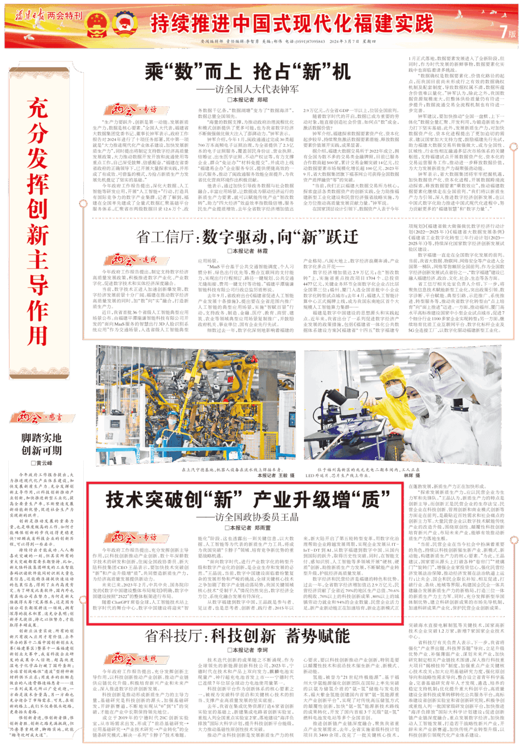 今年政府工作報告提出,充分發(fā)揮創(chuàng)新主導(dǎo)作用,以科技創(chuàng)新推動產(chǎn)業(yè)創(chuàng)新。數(shù)十年深耕數(shù)字技術(shù)的研發(fā)和創(chuàng)新,住閩全國政協(xié)委員、新大陸科技集團CEO王晶表示,要加快技術(shù)突破創(chuàng)“新”和產(chǎn)業(yè)升級增“質(zhì)”,共同塑造新質(zhì)生產(chǎn)力,為經(jīng)濟高質(zhì)量發(fā)展提供新動力。