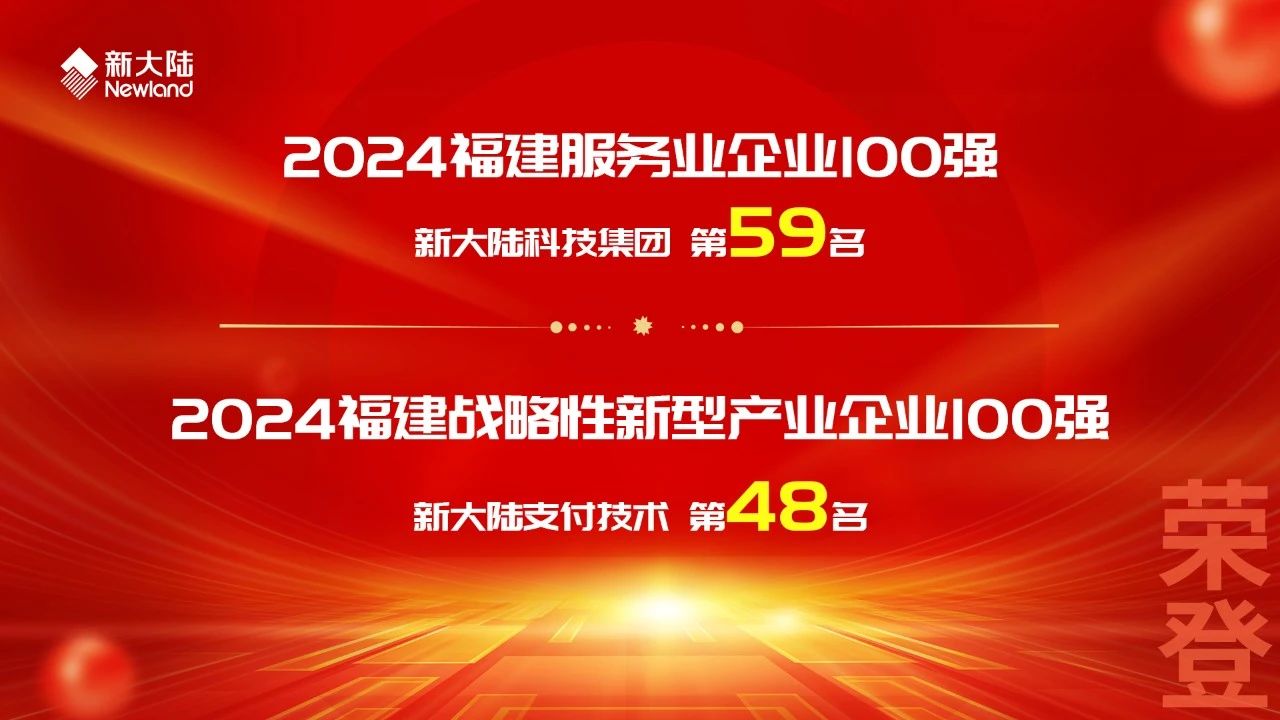 11月8日,2024福建企業100強發布大會暨福建企業發展專題講座在福州召開。大會以“全面深化改革,爭創一流企業”為主題,公布了2024福建企業100強榜單,包括“2024福建企業100強、福建制造業企業100強、福建服務業企業100強、福建戰略性新興產業企業100強”等四個榜單。新大陸連續六年入圍榜單,新大陸科技集團榮登2024福建服務業企業百強榜單,位列第59名;新大陸支付技術公司榮登2024福建戰略性新型產業企業百強榜單,位列第48名。