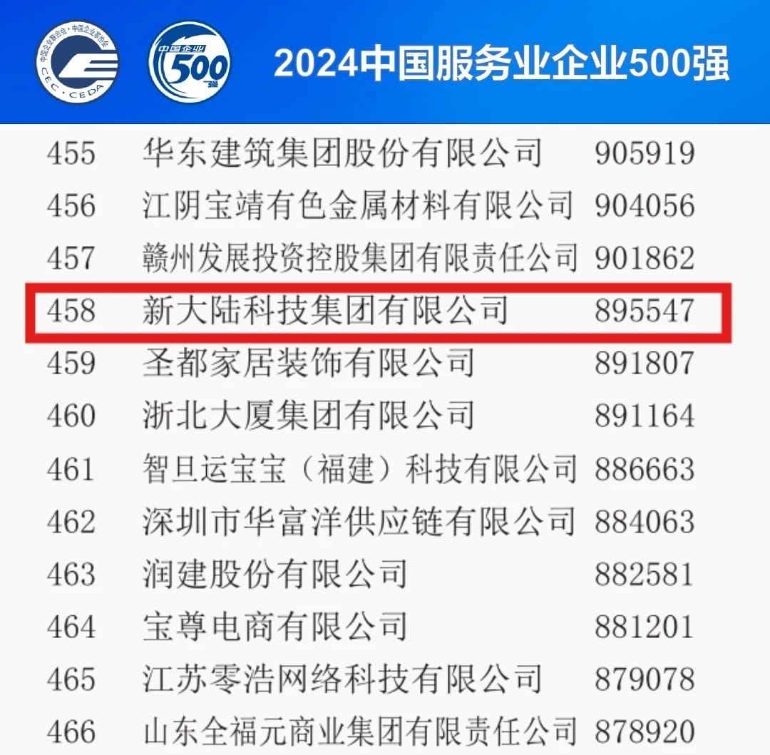 9月11日,以“向‘新’而行 打造更多世界一流企業(yè)”為主題的“2024中國500強企業(yè)高峰論壇”在天津市舉行。會上,中國企業(yè)聯(lián)合會、中國企業(yè)家協(xié)會發(fā)布了2024中國服務業(yè)企業(yè)500強相關榜單及其分析報告。新大陸連續(xù)五年躋身500強行列。入選企業(yè)還有國家電網(wǎng)、中國工商銀行、中國建設銀行等。
