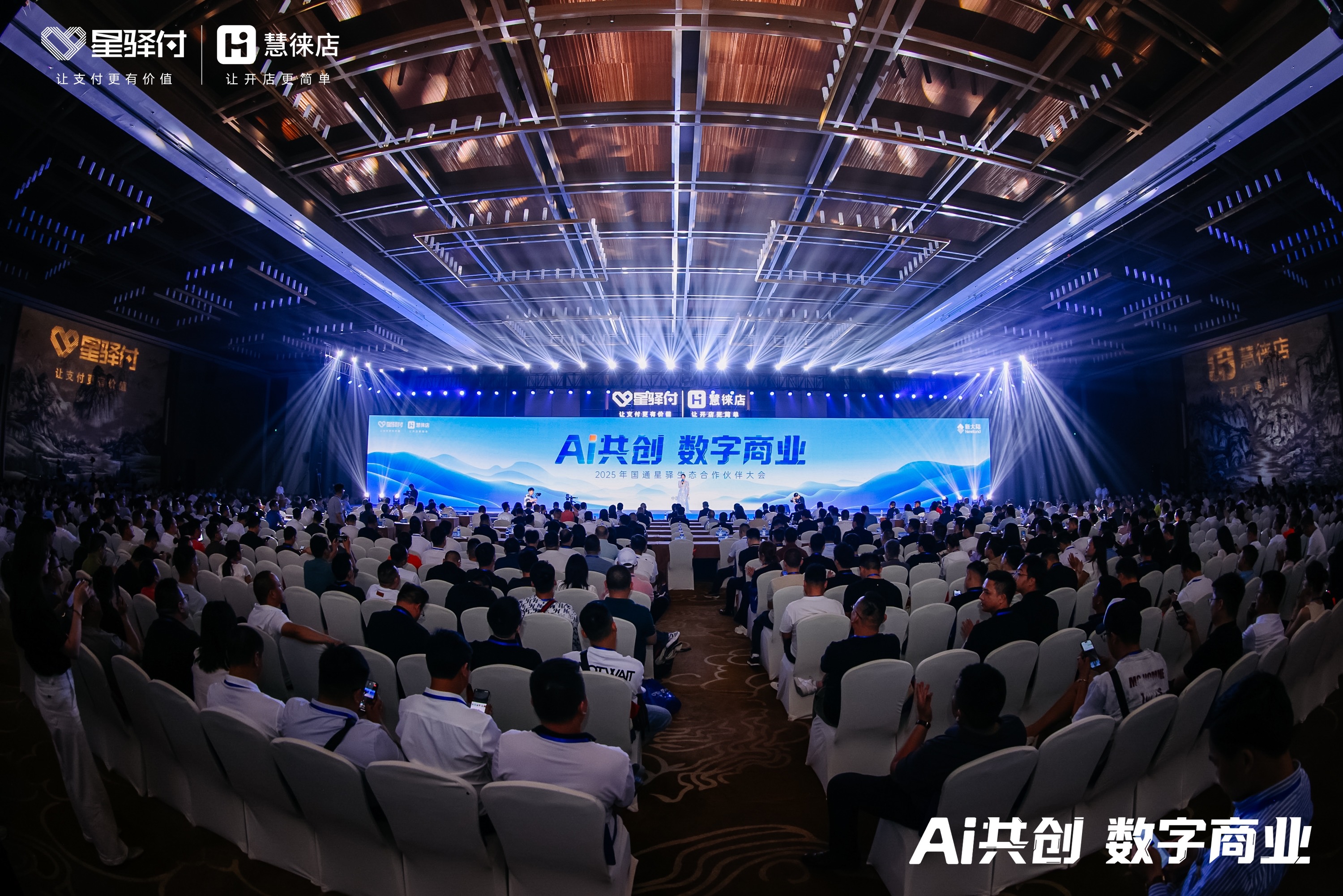 閩江之畔,數(shù)字浪潮澎湃而起。5月7日,福州閩越水鎮(zhèn)迎來一場數(shù)字商業(yè)盛會——“AI共創(chuàng) 數(shù)字商業(yè)”2025年國通星驛生態(tài)合作伙伴大會。福建省商務(wù)廳相關(guān)領(lǐng)導(dǎo),北京大學(xué)光華管理學(xué)院教授,中國銀聯(lián)及華通銀行、興業(yè)銀行、民生銀行、華夏銀行、浦發(fā)銀行等金融機構(gòu)代表,全國各地的上千位生態(tài)合作伙伴代表線下參會。新大陸科技集團董事長胡鋼、董事副總裁林學(xué)杰及集團和上市公司領(lǐng)導(dǎo)齊弘、徐志凌、胡鵠蒞臨大會現(xiàn)場。新大陸國通星驛董事長陳藝、總經(jīng)理林堅攜管理團隊與眾位與會領(lǐng)導(dǎo)、嘉賓共同探討數(shù)字商業(yè)在AI浪潮下的創(chuàng)新發(fā)展路徑。