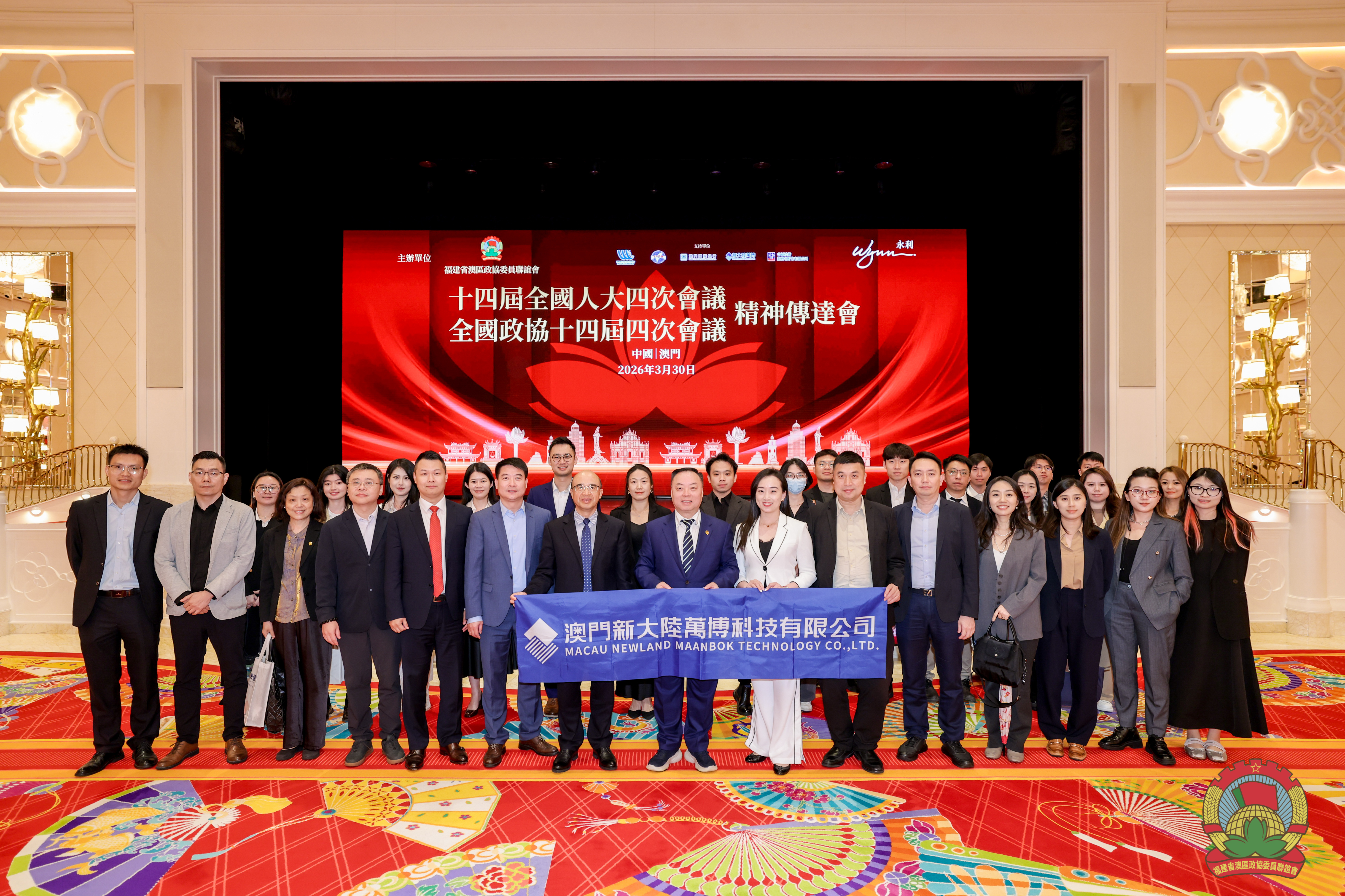 為深入學(xué)習(xí)貫徹2026年全國兩會精神,把握國家「十五五」規(guī)劃機(jī)遇、助力澳門更好融入國家發(fā)展大局,由福建省澳區(qū)政協(xié)委員聯(lián)誼會主辦,永利澳門、澳門中華文化發(fā)展促進(jìn)會、海峽兩岸青年文化交流中心、澳門臺商聯(lián)誼會、澳門國際銀行、澳門新大陸萬博科技有限公司、中福技術(shù)服務(wù)(澳門)有限公司聯(lián)合支持的「十四屆全國人大四次會議、全國政協(xié)十四屆四次會議精神傳達(dá)會」于3月30日在永利皇宮宴會廳隆重舉行。福建省澳區(qū)政協(xié)委員聯(lián)誼會名譽(yù)會長、澳門新大陸萬博科技董事總經(jīng)理劉金東攜公司骨干參與本次活動。